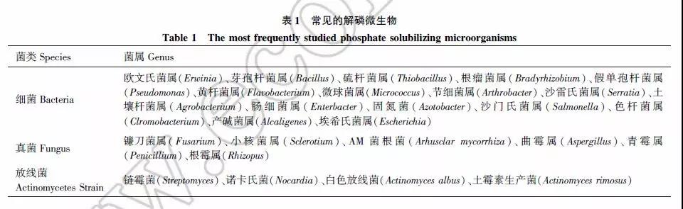 解磷微生物的種類(lèi)多而且復(fù)雜,根據(jù)微生物的種類(lèi)可以分為解磷細(xì)菌、解磷真菌、解磷放線菌。土壤中的解磷微生物群落中,解磷細(xì)菌占1%—50%,而解磷真菌僅占0.1%—0.5%。其中常見(jiàn)的解磷微生物如表 1 所示: