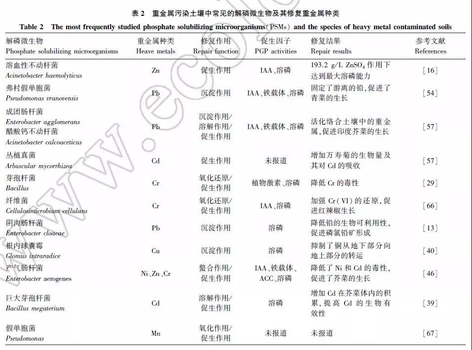 近年來(lái),具有重金屬解毒能力和促進(jìn)植物生長(zhǎng)功能的解磷微生物在土壤重金屬污染修復(fù)中被應(yīng)用和探索, 如表 2 所示。