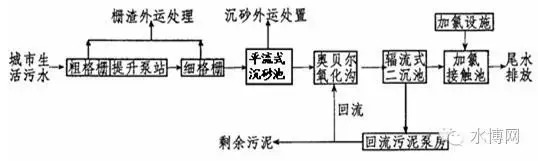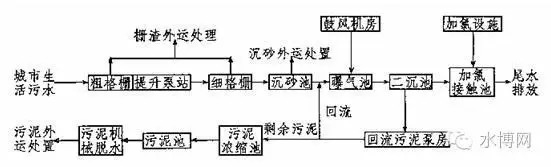 傳統(tǒng)活性污泥法及其傳統(tǒng)形式改進型,有A/O與A2/O法。A/O法有兩種,一是用于降磷的厭氧-好氧工藝,一是用于降氮的缺氧-好氧工藝。A2/O法則是即除氮又除磷的工藝?;钚晕勰喾ǖ淖罨玖鞒淌窍蛭鬯凶⑷肟諝膺M行曝氣,并持續(xù)一段時間后,污水中即生成一種絮凝體,這種絮凝體主要由大量繁殖的微生物群體所構(gòu)成,它易于沉淀分離,并使污水得到澄清,這就是“活性污泥”。活性污泥法則是以活性污泥為主體的生物處理方法,它的主要構(gòu)筑物是曝氣池和二次沉淀池,如下圖所示: