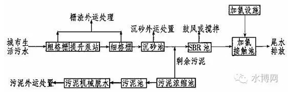 (6)除磷脫氮。一個運行周期內(nèi),厭氧、兼氧、好氧交替變化,在一個池內(nèi)實現(xiàn)了除磷脫氮。其工藝流程如下(包括污泥處理)。