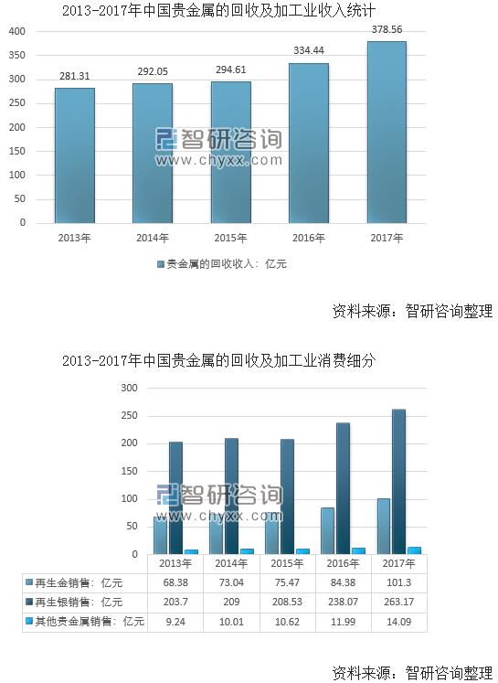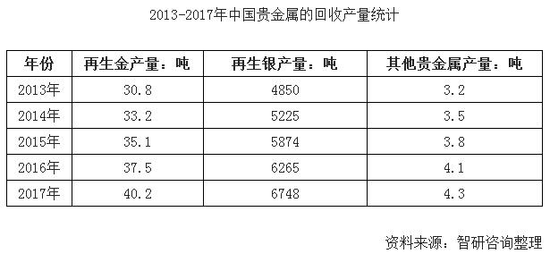 近兩年,在我國廢舊回收體系不斷完善的基礎(chǔ)上,我國貴金屬回收產(chǎn)業(yè)不斷發(fā)展,回收量和回收及加工企業(yè)的收入也在不斷的增長中,2016年我國再生金的產(chǎn)量達(dá)到了37.5噸,2017年增長至40.2噸,同時(shí)再生金占我國黃金總產(chǎn)量的比例不斷提升,中國黃金協(xié)會(huì)的統(tǒng)計(jì)數(shù)據(jù)顯示,2016年和2017年我國黃金產(chǎn)量總量分別為453.5噸和426.1噸,再生金產(chǎn)量占比分別為8.27%和9.43%,同時(shí)相關(guān)企業(yè)的再生金銷售收入也從84.38億元增長至101.30億元。而再生銀依然是我國回收量最大的貴金屬,2016年達(dá)到6265噸,2017年增長至6265噸,相應(yīng)的收入分別為238.07億元和263.17億元。