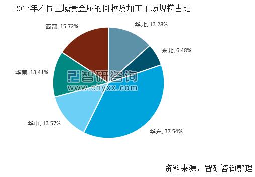 目前,國內(nèi)貴金屬的回收及加工需求市場(chǎng)主要集中在人口密集、經(jīng)濟(jì)發(fā)達(dá)的地區(qū)以及服務(wù)水平較高的各省一二線城市,存在一定的區(qū)域性特征。其中,華東地區(qū)市場(chǎng)需求最大,占全國比重達(dá)到37.54%。其次是華中、華南和華北地區(qū),總的來看,這幾個(gè)地區(qū)基礎(chǔ)工業(yè)發(fā)展較為完善,含廢舊貴金屬的產(chǎn)品消費(fèi)量大,廢舊貴金屬產(chǎn)業(yè)具有較大的想象空間。但是從整個(gè)產(chǎn)業(yè)的發(fā)展完善的程度來看,北京地區(qū)已經(jīng)基本形成了完善的回收加工體系,上海地區(qū)的緊隨其后,華東和華南的部分區(qū)域依然以小作坊為主,產(chǎn)業(yè)發(fā)展環(huán)境急需規(guī)范。