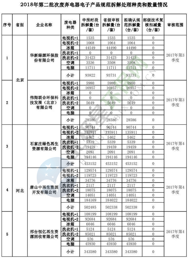 2018年第二批次廢電器拆解處理技術復核內(nèi)容包括25個省份的81家企業(yè)的137份廢電器拆解處理情況審核報告。目前,69家企業(yè)通過技術復核,13家企業(yè)未通過技術復核(其中1家企業(yè)部分審核時段未通過技術復核),相關情況納入本批次進行公示,公示時間為5個工作日。