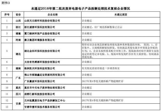 附件3:《未通過2018年第二批次廢棄電器電子產(chǎn)品拆解處理技術復核企業(yè)情況公示表》