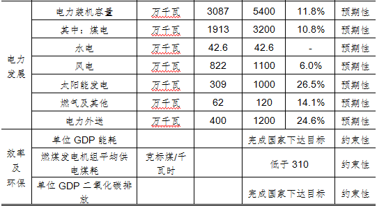能源能效水平進(jìn)一步提升。單位GDP能耗完成國家下達(dá)目標(biāo)。燃煤發(fā)電機(jī)組平均供電煤耗低于310克標(biāo)煤/千瓦時(shí),其中新建煤電機(jī)組平均供電煤耗低于300克標(biāo)煤/千瓦時(shí);單位GDP二氧化碳排放完成國家下達(dá)目標(biāo),二氧化硫、氮氧化物及煙塵排放控制在國家下達(dá)目標(biāo)之內(nèi)。