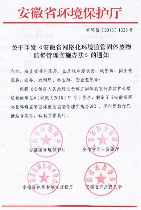 日前,安徽環(huán)保廳公布《安徽省網格化環(huán)境監(jiān)管固體廢物監(jiān)督管理實施辦法》,詳情如下: