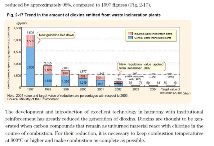 3)國內(nèi)有些人想當(dāng)然的認(rèn)為,日本垃圾焚燒二惡英排放量大幅度下降是由于生活垃圾分類收集做得好。根據(jù)日本環(huán)境部發(fā)布的建設(shè)循環(huán)型型社會(huì)白皮書(technologies to support a sound material-cycle society-development of 3R and waste management technologies 日本環(huán)境部, 2007),日本生活垃圾焚燒廠二惡英年排放量由5000ngTEQ(1997年)下降到71 ngTEQ(2003年)、52 ngTEQ(2007年),分別下降98%、99%。日本環(huán)境部總結(jié)生活垃圾焚燒二惡英大幅度下降的原因:執(zhí)行嚴(yán)格的標(biāo)準(zhǔn)、淘汰或關(guān)停不達(dá)標(biāo)的生活垃圾焚燒廠、保障生活垃圾在800度以上穩(wěn)定燃燒,煙氣快速冷卻以及煙氣處理。要保障生活垃圾在800度以上穩(wěn)定燃燒,工藝技術(shù)上要實(shí)現(xiàn)連續(xù)穩(wěn)定焚燒,就要采用有規(guī)模的爐排爐;要使煙氣快速冷卻到300度以下(也就是避開所謂二惡英再合成的溫度區(qū)間),采用余熱鍋爐即可以實(shí)現(xiàn)快速冷卻,這對(duì)于有規(guī)模生活垃圾焚燒廠是自然的事。至于煙氣處理包括袋式除塵、酸性氣體洗滌、活性炭吸附、催化脫硝這些技術(shù)工藝是保障生活垃圾焚燒二惡英達(dá)標(biāo)排放的重要技術(shù)手段,總之,是技術(shù)手段的進(jìn)步使日本生活垃圾焚燒二惡英排放大幅度減少。1997年到2007年日本焚燒的生活垃圾無論是成分還是量都沒有明顯變化,所謂生活垃圾分類使二惡英大幅度下降完全是一些國人的臆想。