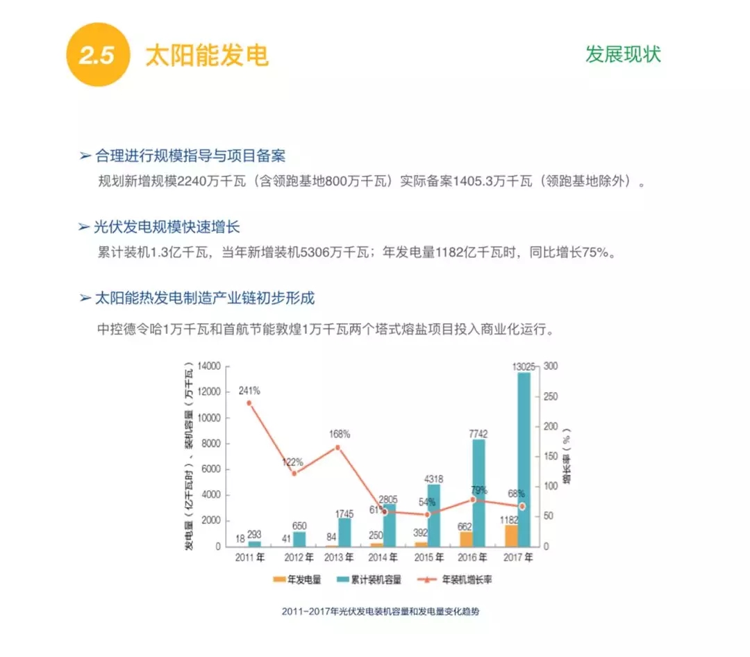 在太陽(yáng)能發(fā)電方面,去年我國(guó)新增裝機(jī)5306萬(wàn)千瓦,目前我國(guó)光伏發(fā)電累計(jì)裝機(jī)已達(dá)1.3億千瓦。同時(shí),我國(guó)太陽(yáng)能熱發(fā)電制造產(chǎn)業(yè)鏈也初步形成。2017年太陽(yáng)光伏發(fā)電投資規(guī)模快速增長(zhǎng),比2016年增長(zhǎng)了41%,同時(shí)單位千瓦造價(jià)部分已經(jīng)降低至每千瓦5500元以下,棄光的現(xiàn)象也得到了有效控制。