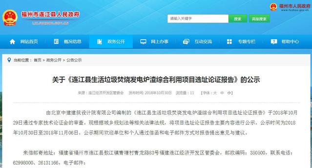 2018年10月30日,福州市連江經(jīng)濟(jì)開(kāi)發(fā)區(qū)管委會(huì)公示《連江縣生活垃圾焚燒發(fā)電爐渣綜合利用項(xiàng)目選址論證報(bào)告》。