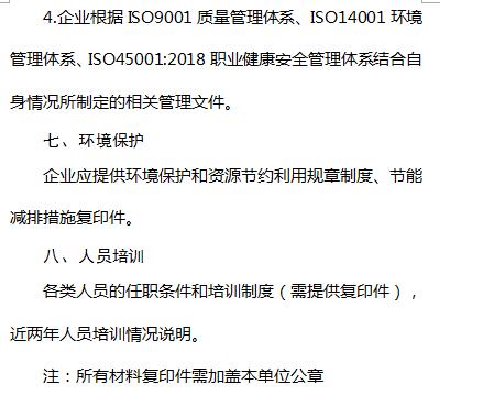 (十四)企業(yè)應(yīng)具備ISO9001質(zhì)量管理體系、ISO14001環(huán)境管理體系、ISO45001:2018職業(yè)健康安全管理體系,結(jié)合企業(yè)經(jīng)營(yíng)生產(chǎn)和產(chǎn)品使用要求等方面的實(shí)際情況,建立相應(yīng)的管理體系。