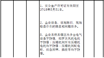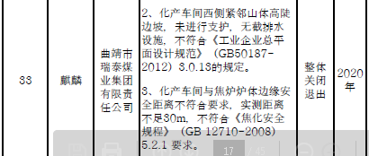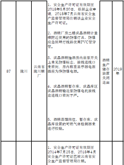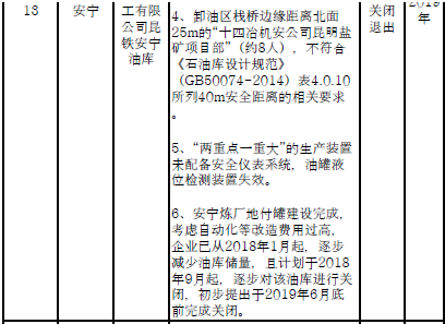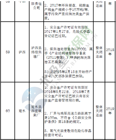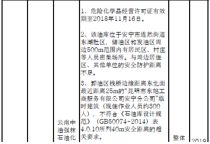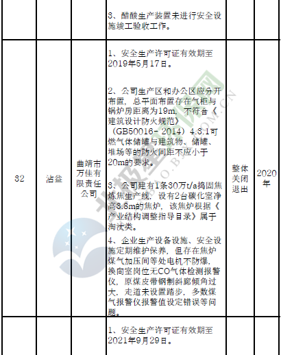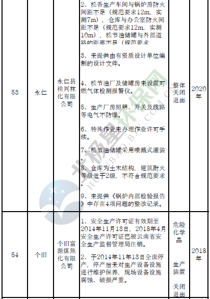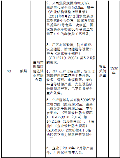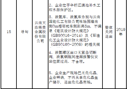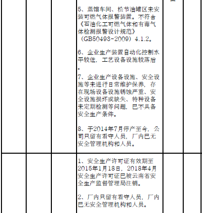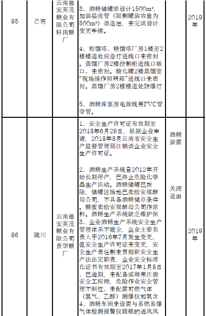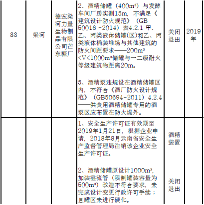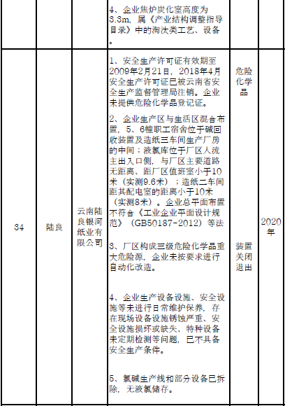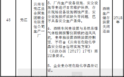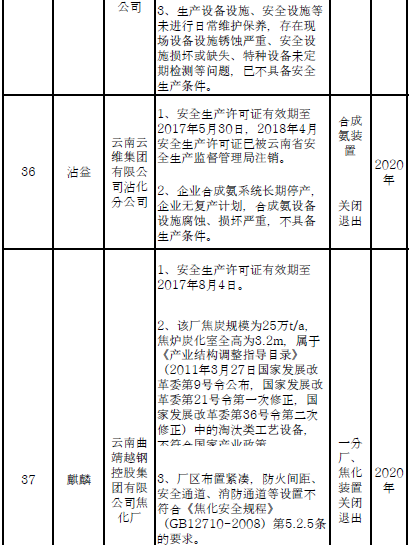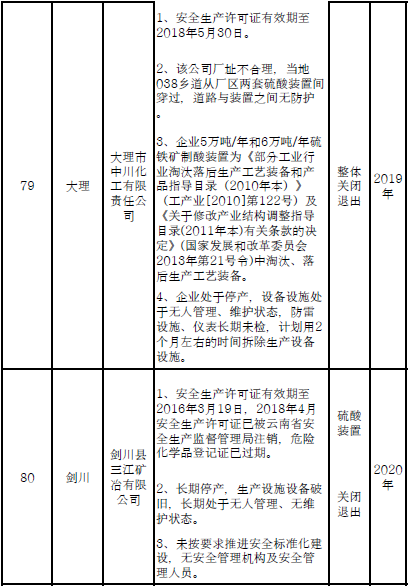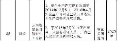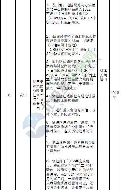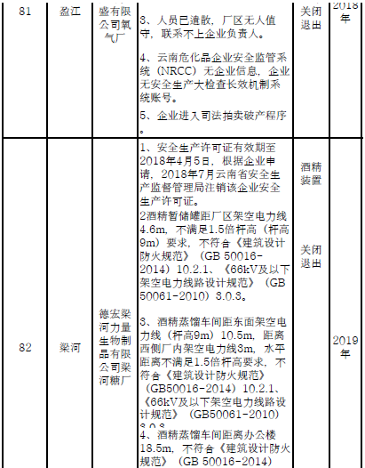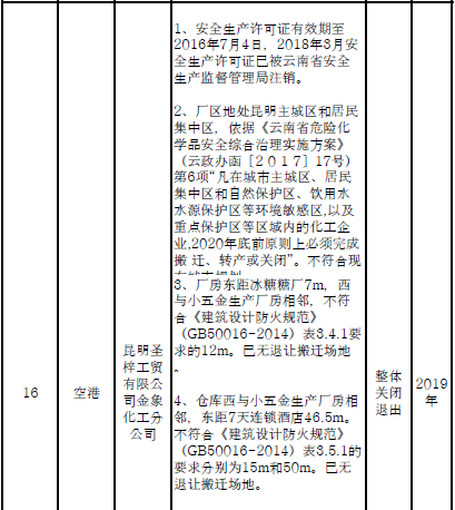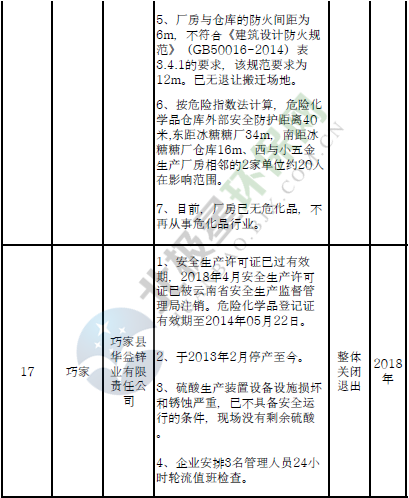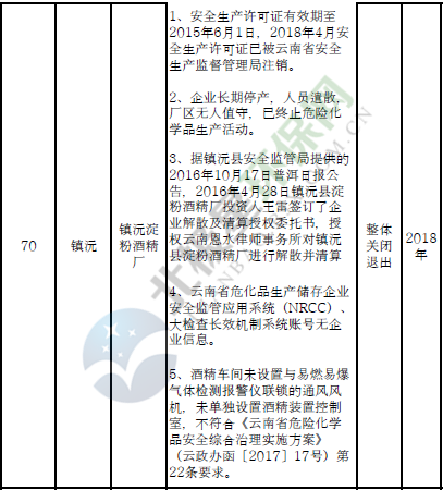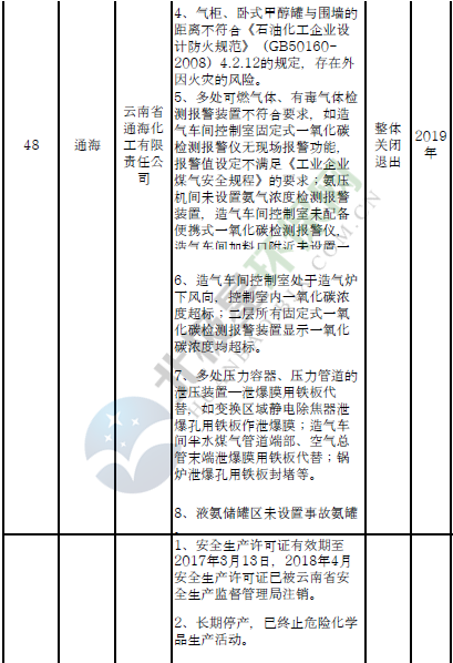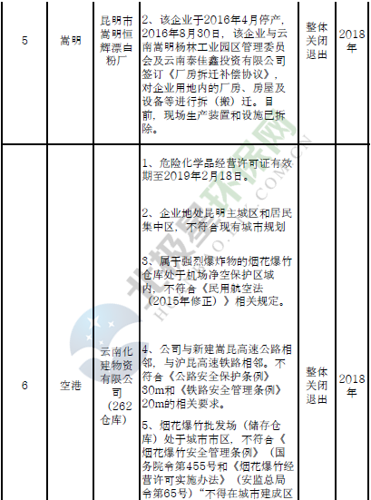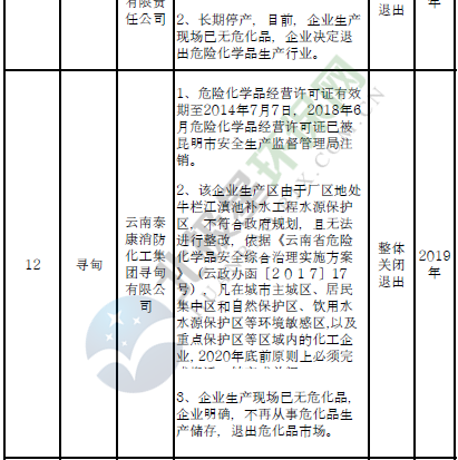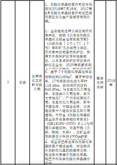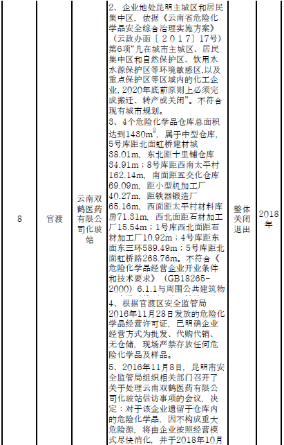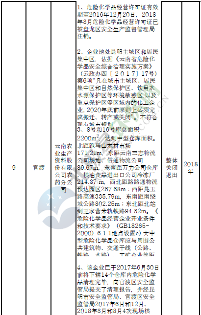 四、對8戶(詳見附件3)位于人員密集區(qū)、安全距離不足、工藝技術落后、存在重大隱患的危險化學品生產(儲存)企業(yè)進行綜合整治,2020年底前全部完成,各相關企業(yè)具體完成時間由各州市政府結合本地實際確定。各州市政府要統(tǒng)籌制定重大隱患綜合整治方案,做到“一企一方案”并報省安委會辦公室。其中:昆明市2戶,曲靖市1戶,玉溪市1戶,楚雄州1戶,文山州1戶,西雙版納州1戶,大理州1戶。