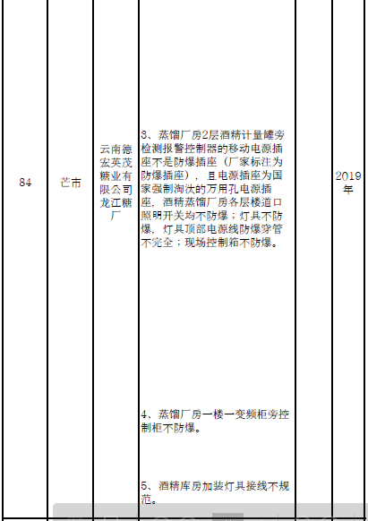 五、涉及重點監(jiān)管危險化工工藝的43戶企業(yè)、涉及重點監(jiān)管危險化學品的107戶企業(yè)以及213個重大危險源,各州市政府根據(jù)具體情況組織進行整改。2019年10月底完成自動化控制和安全儀表系統(tǒng)改造升級工作。2019年10月底,未單獨設置控制室的乙醇生產企業(yè)按照規(guī)程要求完成改造,酒精生產車間的易燃易爆氣體檢測報警儀與通風風機實現(xiàn)聯(lián)鎖。