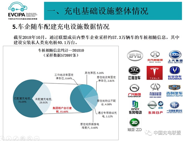 截至2018年10月,通過聯(lián)盟成員內(nèi)整車企業(yè)采樣約57.3萬輛車的車樁相隨信息,其中建設(shè)安裝私人類充電樁40.1萬臺。