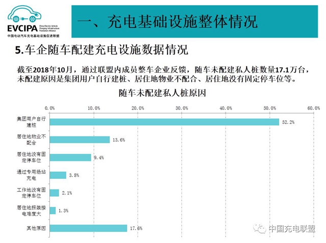 截至2018年10月,通過聯(lián)盟內(nèi)成員整車企業(yè)反饋,隨車未配建私人樁數(shù)量17.1萬臺,未配建原因是集團(tuán)用戶自行建樁、居住地物業(yè)不配合、居住地沒有固定停車位等。