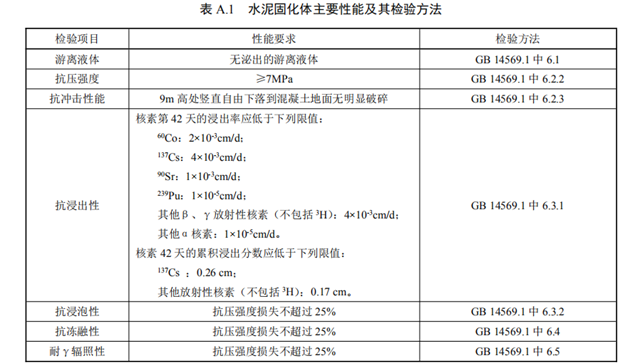 水泥固化體的性能應(yīng)滿足GB 14569.1中第5章規(guī)定的要求,參見附錄A。
