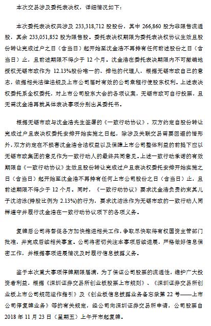 中金環(huán)境11月22日晚間公告,公司實(shí)際控制人沈金浩擬將1.28億股股份(占公司總股本的6.65%)轉(zhuǎn)讓給無(wú)錫市政,轉(zhuǎn)讓價(jià)格為4.42元/股,交易作價(jià)5.65億元。此外,沈金浩擬通過(guò)表決權(quán)委托方式將剩余股份中2.33億股股份對(duì)應(yīng)的表決權(quán)委托給無(wú)錫市政,占公司總股本的12.13%。交易完成后公司控股股東將變更為無(wú)錫市政,實(shí)際控制人將變更為無(wú)錫市國(guó)資委。公司股票將于11月23日復(fù)牌。