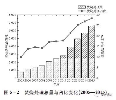 截止到2015年底,我國(含設(shè)市城市與縣城)共建成生活垃圾焚燒設(shè)施257座(其中2015年新建成設(shè)施35座),設(shè)施占比12.4%,總處理能力235224噸/日(其中2015年新建成設(shè)施處理能力34623噸/日),占無害化處理能力的31.0%;年焚燒垃圾6577.0萬噸,占無害化處理總量的28.3%。與2014年相比,在焚燒設(shè)施、焚燒處理能力和焚燒處理量上分別同比增長15.8%、17.3%和15.9%,在設(shè)施數(shù)量占比、設(shè)施能力占比和處理量占比方面分別增加了1.0、2.4和1.5個百分點。2005年度至2015年度焚燒設(shè)施規(guī)模與占比變化見圖5-1和圖5-2所示,與“十一五”期間相比,“十二五”區(qū)間,尤其是2012年以后,焚燒處理能力年增長20%以上。
