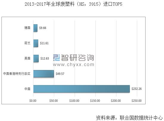 2017年我國再生塑料產(chǎn)量為1693萬噸,同步下降9.85%。從原材料市場供給來看,2013-2017年間,中國是全球最大的廢塑料(HS:3915)進口國,進口總額達232.26億美元,排在第二位的是中國香港特別行政區(qū),進口總額為49.57億美元,美國、荷蘭、德國進口總額依次為12.63億美元、11.61億美元、9.66億美元。