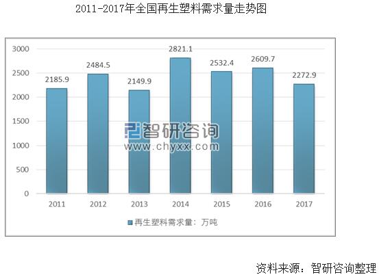由于產(chǎn)量產(chǎn)能供給減少,我國再生塑料需求量從2014年的2821.1萬噸下降至2017年的2272.9萬噸。