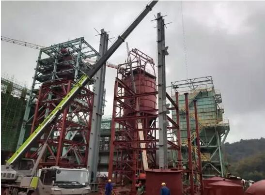 2、煙氣處理:收塵器頂部電動(dòng)葫蘆吊架組拼吊裝就位;反應(yīng)塔直筒焊接,頂部電動(dòng)葫蘆吊架吊裝就位;消石灰平臺(tái)鋼構(gòu)安裝;灰?guī)熘麂摌?gòu)安裝,樓梯鋼架安裝;