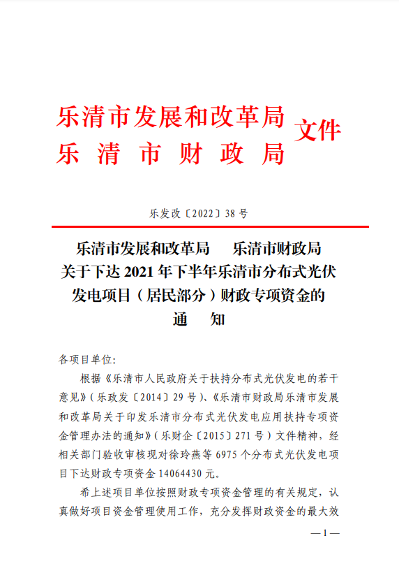 近日,浙江省樂清市發(fā)展和改革局發(fā)布《關(guān)于下達(dá)2021年下半年樂清市分布式光伏發(fā)電項目(居民部分)財政專項資金的通知》。詳情如下: 各項目單位: 根據(jù)《樂清市人民政府關(guān)于扶持分布式光伏發(fā)電的若干意見》(樂政發(fā)〔2014〕29號)、《樂清市財政局樂清市發(fā)展和改革局關(guān)于印發(fā)樂清市分布式光伏發(fā)電應(yīng)用扶持專項...