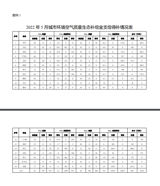 根據(jù)《河南省污染防治攻堅戰(zhàn)領(lǐng)導(dǎo)小組辦公室關(guān)于印發(fā)河南省城市環(huán)境空氣質(zhì)量生態(tài)補償辦法(試行)等辦法的通知》(豫環(huán)攻堅辦〔2020〕15號)要求,河南省生態(tài)環(huán)境廳廳對各省轄市的城市環(huán)境空氣質(zhì)量生態(tài)補償金的支償、得補情況進行了計算。截止2022年5月,各省轄市共支償城市環(huán)境空氣質(zhì)量生態(tài)補償金2617萬元,...