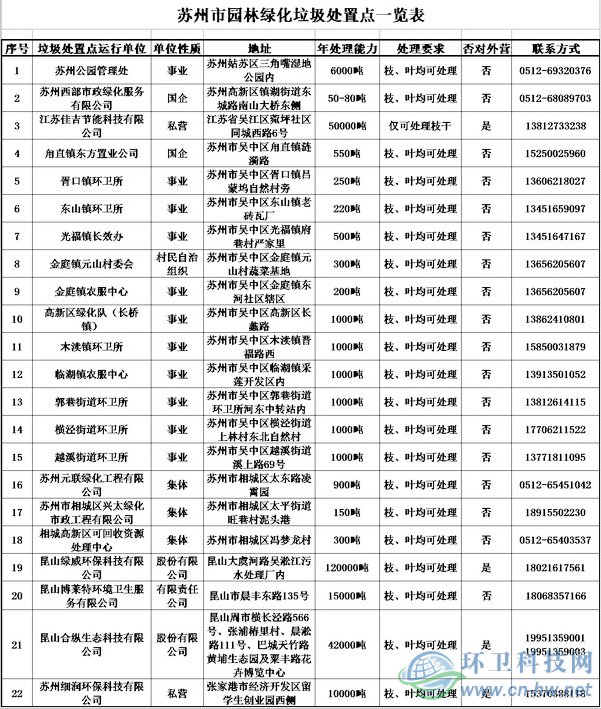 環(huán)衛(wèi)科技網(wǎng)訊,10月18日,蘇州市園林和綠化管理局在網(wǎng)上發(fā)布《蘇州市園林綠化垃圾處置點信息公示》,公示顯示,蘇州共有22個園林綠化垃圾處置點運(yùn)行單位,年處理能力達(dá)25.24余萬噸。22個運(yùn)行單位中,有4家公司(兩家股份有限公司,兩家私營單位)對外營運(yùn),年處理能力總計22.2萬噸。 下表為整理《蘇州發(fā)...