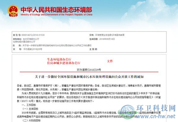 9月18日,生態(tài)環(huán)境部辦公廳與住房和城鄉(xiāng)建設(shè)部辦公廳聯(lián)合印發(fā)《關(guān)于進(jìn)一步做好全國環(huán)保設(shè)施和城市污水垃圾處理設(shè)施向公眾開放工作的通知》(以下簡稱《通知》)?!锻ㄖ芬?,2020年年底前,全國所有地級及以上城市選擇至少1座環(huán)境監(jiān)測設(shè)施、1座城市污水處理設(shè)施、1座垃圾處理設(shè)施、1座危險廢物集中處置或廢棄...
