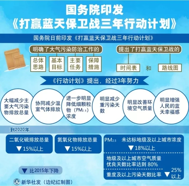 經(jīng)李克強(qiáng)總理簽批,國務(wù)院日前印發(fā)《打贏藍(lán)天保衛(wèi)戰(zhàn)三年行動(dòng)計(jì)劃》(以下簡稱《行動(dòng)計(jì)劃》),明確了大氣污染防治工作的總體思路、基本目標(biāo)、主要任務(wù)和保障措施,提出了打贏藍(lán)天保衛(wèi)戰(zhàn)的時(shí)間表和路線圖。來源:新華社、中國政府網(wǎng)圖表:國務(wù)院印發(fā)《打贏藍(lán)天保衛(wèi)戰(zhàn)三年行動(dòng)計(jì)劃》新華社發(fā) 邊紀(jì)紅 制圖《行動(dòng)計(jì)劃》指出,...