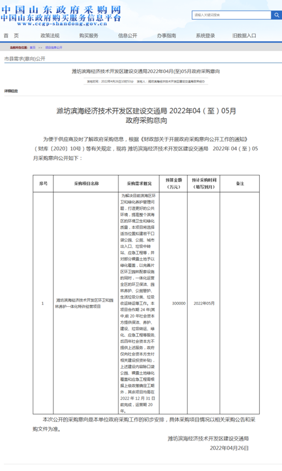 采購項目名稱:濰坊濱海經(jīng)濟技術(shù)開發(fā)區(qū)環(huán)衛(wèi)和園林養(yǎng)護(hù)一體化特許經(jīng)營項目預(yù)算金額:300000(萬元)預(yù)計采購時間:2022年05月采購需求概況:為解決目前濱海區(qū)環(huán)衛(wèi)和綠化養(yǎng)護(hù)管理問題,打造更好的公共環(huán)境,提高整個濱海區(qū)的環(huán)境衛(wèi)生和綠化質(zhì)量,本項目將選擇適當(dāng)位置擬建若干口袋公園、公廁、城市出入口、垃圾中...