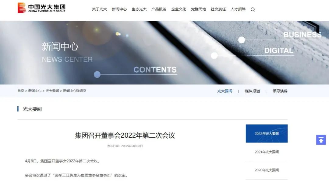 4月8日,集團(tuán)召開董事會2022年第二次會議決議通過,選舉王江先生為本公司董事長。 據(jù)中國光大集團(tuán)股份公司官網(wǎng)消息,4月8日,集團(tuán)召開董事會2022年第二次會議決議通過,選舉王江先生為本公司董事長。根據(jù)公告,王江現(xiàn)任本公司黨委書記、董事長,兼任中國光大集團(tuán)股份公司黨校名譽(yù)校長,中國光大銀行股份有限公...