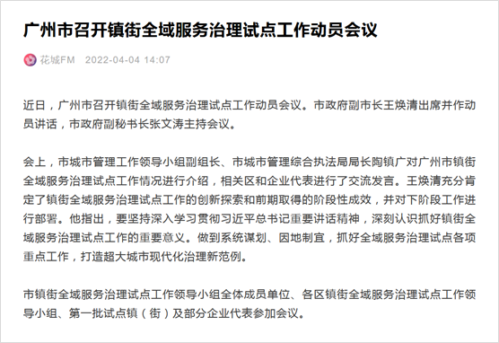創(chuàng)新思路推動城市治理體系和治理能力現(xiàn)代化,廣州為超大城市鎮(zhèn)街全域服務(wù)治理探路。鳳凰網(wǎng)廣東自市城市管理綜合執(zhí)法局獲悉,繼2021年底廣州市印發(fā)《關(guān)于開展鎮(zhèn)街全域服務(wù)治理試點工作方案》以來,2022年4月1日,廣州市召開鎮(zhèn)街全域服務(wù)治理試點工作動員會議,匯報有關(guān)工作開展情況,全面啟動全域服務(wù)治理試點工作...