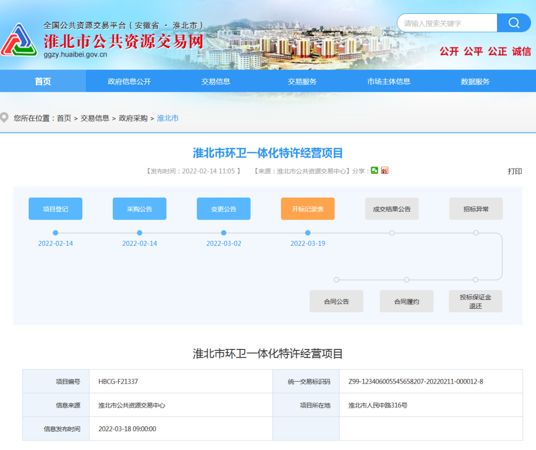 淮北市公共資源交易網(wǎng)消息,2022年3月19日,備受業(yè)內(nèi)關(guān)注的淮北市環(huán)衛(wèi)一體化特許經(jīng)營項目公布開標(biāo)記錄表,共有40家企業(yè)投標(biāo)。 中環(huán)潔、康潔科技集團(tuán)、北控城市服務(wù)、中聯(lián)環(huán)境、福龍馬、僑銀股份、保利物業(yè)、福建東飛環(huán)境、啟迪環(huán)境、家寶園林、勁旅環(huán)境、徐工環(huán)境、中節(jié)能、傲藍(lán)得、美欣達(dá)、高能時代等眾多知名企...