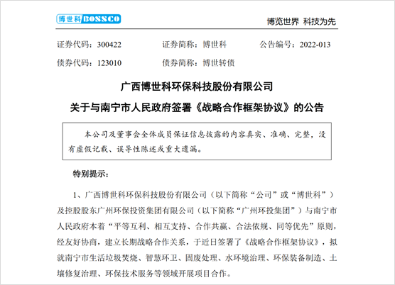 近日,博世科(300422.SZ)發(fā)布公告,公司及控股股東廣州環(huán)保投資集團(tuán)有限公司(簡稱“廣州環(huán)投集團(tuán)”)作為乙方與南寧市人民政府(甲方)近日簽署了《戰(zhàn)略合作框架協(xié)議》,擬就南寧市生活垃圾焚燒、智慧環(huán)衛(wèi)、固廢處理、水環(huán)境治理、環(huán)保裝備制造、土壤修復(fù)治理、環(huán)保技術(shù)服務(wù)等領(lǐng)域開展項目合作。 協(xié)議內(nèi)容顯示...
