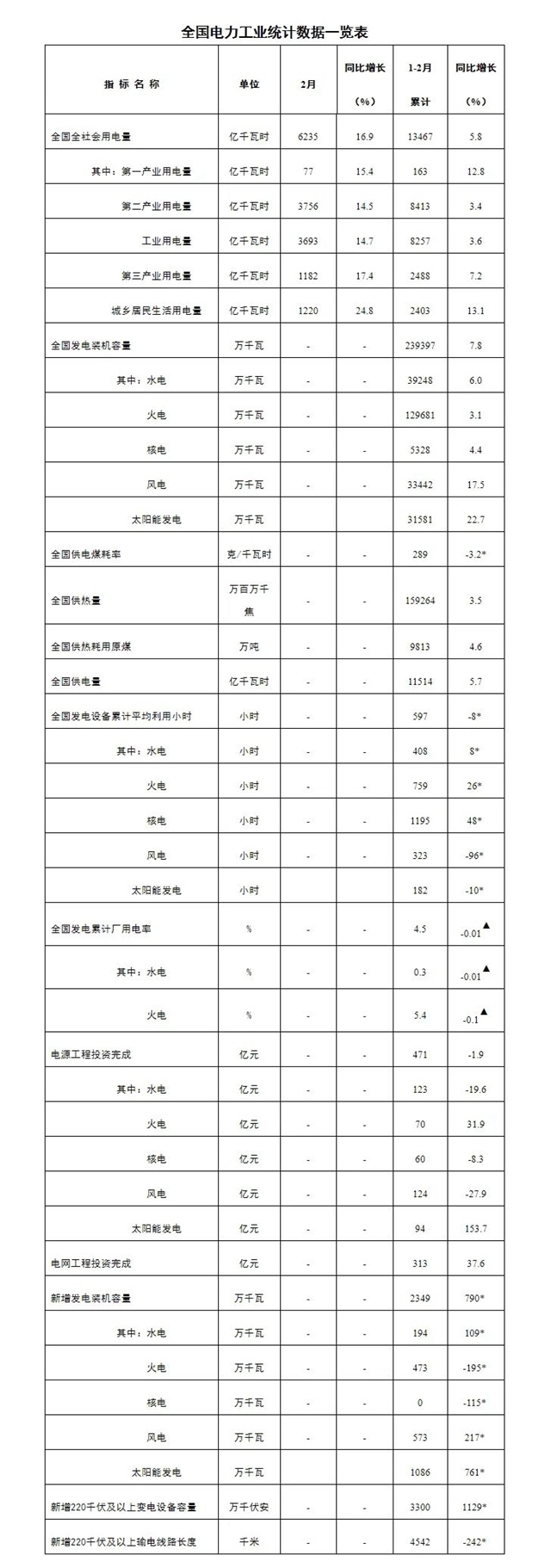 2022年3月21日,國家能源局發(fā)布1-2月份全國電力工業(yè)統(tǒng)計數(shù)據(jù)。截至2月底,全國發(fā)電裝機容量約23.9億千瓦,同比增長7.8%。其中,風(fēng)電裝機容量約3.3億千瓦,同比增長17.5%;太陽能發(fā)電裝機容量約3.2億千瓦,同比增長22.7%。 1-2月份,全國發(fā)電設(shè)備累計平均利用597小時,比上年同期...