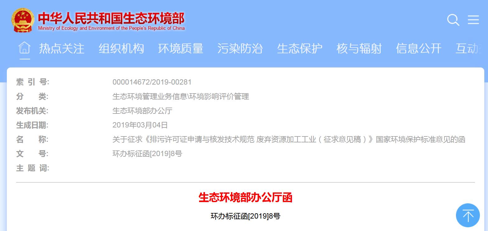 關于征求《排污許可證申請與核發(fā)技術規(guī)范 廢棄資源加工工業(yè)(征求意見稿)》國家環(huán)境保護標準意見的函生態(tài)環(huán)境部辦公廳函環(huán)辦標征函[2019]8號關于征求《排污許可證申請與核發(fā)技術規(guī)范 廢棄資源加工工業(yè)(征求意見稿)》國家環(huán)境保護標準意見的函各有關單位:為落實《國務院辦公廳關于印發(fā)控制污染物排放許可制實施...