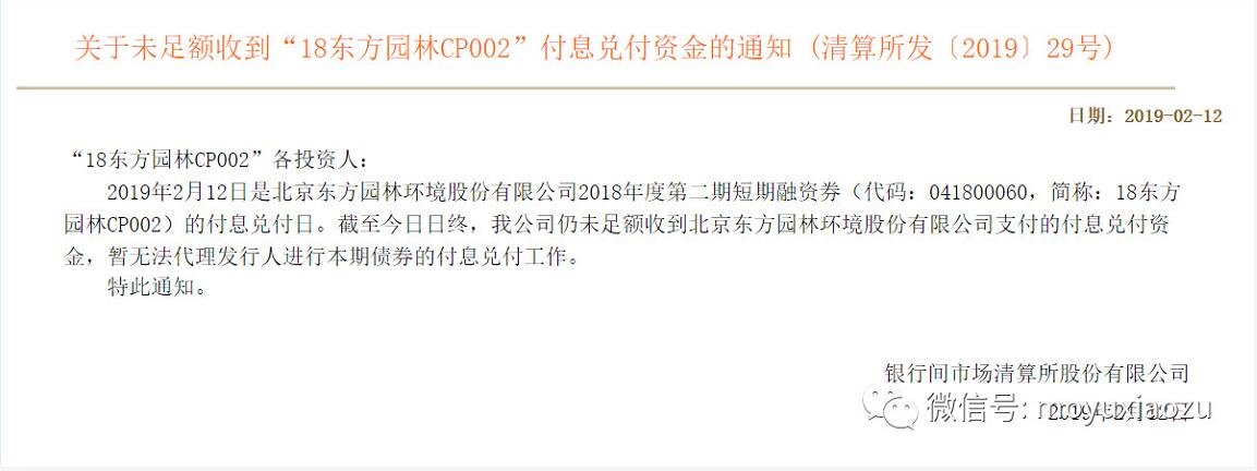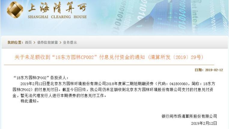 因?yàn)槎倘谌茨苋缙趦陡?,再次讓市?chǎng)神經(jīng)繃緊。2月12日下午,銀行間市場(chǎng)清算所股份有限公司(簡(jiǎn)稱(chēng)上海清算所)公告稱(chēng),2月12日是北京東方園林環(huán)境股份有限公司2018年度第二期短期融資券“18東方園林CP002”的付息兌付日。截至日終,仍未足額收到東方園林支付的付息兌付資金,暫無(wú)法代理發(fā)行人進(jìn)行本期債券...