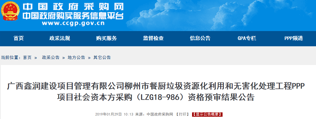 廣西鑫潤建設(shè)項目管理有限公司受柳州市市容管理局 委托,根據(jù)《中華人民共和國政府采購法》等有關(guān)規(guī)定,現(xiàn)對廣西鑫潤建設(shè)項目管理有限公司柳州市餐廚垃圾資源化利用和無害化處理工程PPP項目社會資本方采購(LZG18-986)資格預(yù)審公告進(jìn)行其他招標(biāo),歡迎合格的供應(yīng)商前來投標(biāo)。項目名稱:廣西鑫潤建設(shè)項目管理有...