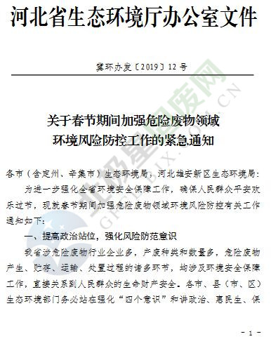近日,河北省生態(tài)環(huán)境廳發(fā)布了關(guān)于春節(jié)期間加強危險廢物領(lǐng)域環(huán)境風(fēng)險防控工作的緊急通知,要求加大涉危險廢物領(lǐng)域重點行業(yè)企業(yè)的環(huán)境監(jiān)管力度,2月份,全省暫停實施跨界危險廢物轉(zhuǎn)運,特殊情況必須轉(zhuǎn)移的,一事一報。詳情如下: