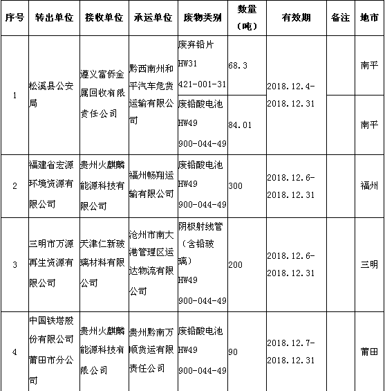 日前福建省環(huán)境保護廳發(fā)布了《2018年12月福建省危險廢物跨省轉(zhuǎn)移情況公告》,共有24項,具體內(nèi)容如下: