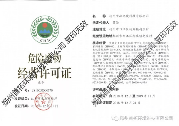 12月26日,首創(chuàng)環(huán)境揚州危險廢物處置項目(揚州首拓環(huán)境科技有限公司)順利取得由江蘇省生態(tài)環(huán)境廳頒發(fā)的《危險廢物經(jīng)營許可證》,這標志著首創(chuàng)環(huán)境在危廢處置產(chǎn)業(yè)的海洋中揚帆起航,再續(xù)新篇章。申領《危險廢物經(jīng)營許可證》是國家對危險廢物經(jīng)營處置企業(yè)行政許可的管理要求,也是危廢處置行業(yè)中所需資料最多、辦理流程...