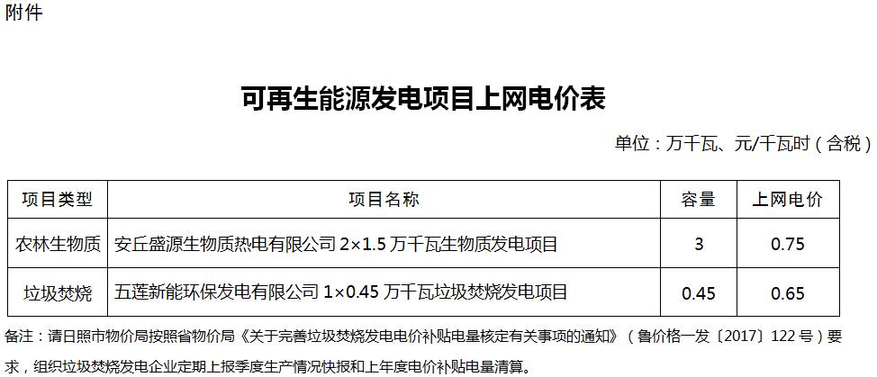 山東省發(fā)展和改革委員會(huì)關(guān)于安丘盛源生物質(zhì)熱電有限公司等可再生能源發(fā)電項(xiàng)目上網(wǎng)電價(jià)的批復(fù)魯發(fā)改價(jià)格〔2018〕1294號(hào)濰坊、日照市物價(jià)局:你們《關(guān)于核定安丘盛源生物質(zhì)熱電有限公司生物質(zhì)發(fā)電項(xiàng)目上網(wǎng)電價(jià)的請(qǐng)示》(濰價(jià)辦發(fā)〔2018〕44號(hào))、《關(guān)于五蓮新能環(huán)保發(fā)電有限公司上網(wǎng)電價(jià)的請(qǐng)示》(日價(jià)格發(fā)〔2...