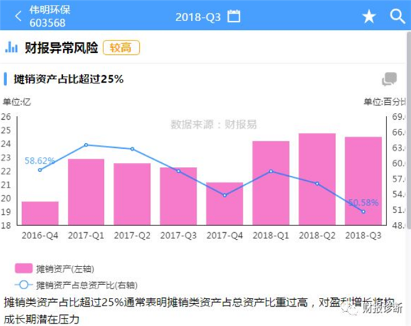 這兩天有網(wǎng)友在質(zhì)疑偉明環(huán)保的一些問題,筆者翻看了財報易上對偉明環(huán)保所做的財務(wù)診斷報告,就下列財報易所發(fā)現(xiàn)的兩個問題跟大家交流一下。1、偉明環(huán)保攤銷資產(chǎn)占比為何那么高?從財報易提示的風(fēng)險中,偉明股份的攤銷資產(chǎn)占比高達(dá)50%,查看公司2018年三季報,主要是無形資產(chǎn)達(dá)到24.42億,占總資產(chǎn)比50.47...