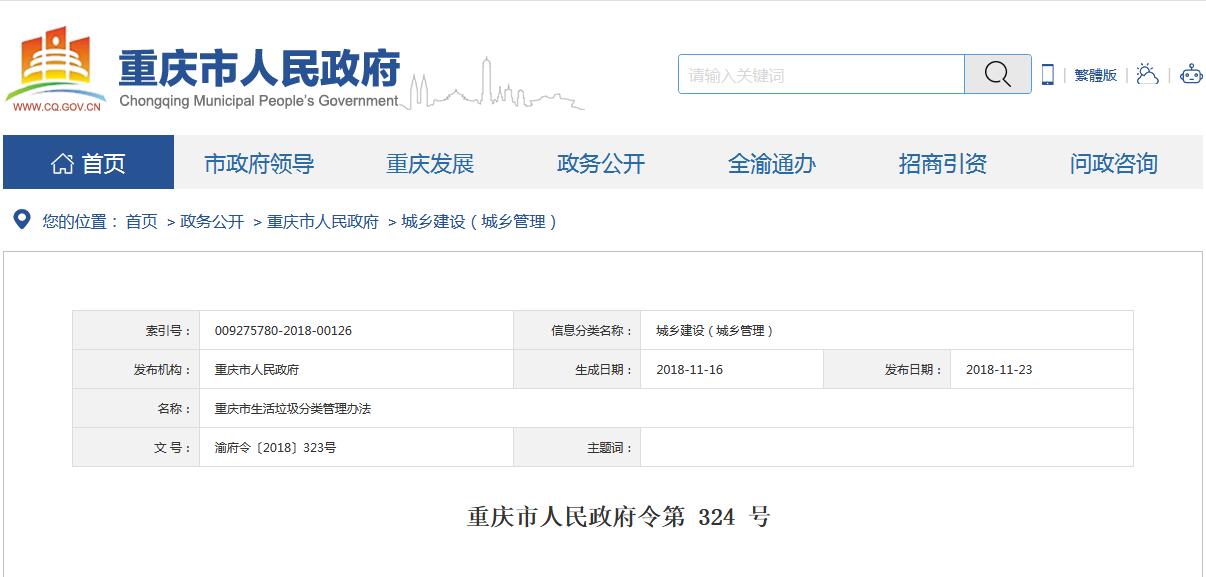 日前,重慶市政府發(fā)布了《重慶市生活垃圾分類管理辦法》,詳情如下:重慶市人民政府令第 324 號(hào)《重慶市生活垃圾分類管理辦法》已經(jīng)2018年11月1日市第五屆人民政府第30次常務(wù)會(huì)議通過,現(xiàn)予公布,自2019年1月1日起施行。市 長(zhǎng) 唐良智2018年11月16日(此件公開發(fā)布)重慶市生活垃圾分類管理辦...