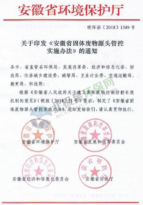 日前,安徽省發(fā)布《安徽省固體廢物源頭管控實(shí)施辦法》,詳情如下:關(guān)于印發(fā)《安徽省固體廢物源頭管控實(shí)施辦法》的通知各市、省直管縣環(huán)保局、發(fā)展改革委、經(jīng)濟(jì)和信息化委、財(cái)政局、住房城鄉(xiāng)建設(shè)委、城管局、衛(wèi)生計(jì)生委、交通運(yùn)輸局、教育局、科技局:根據(jù)《安徽省人民政府關(guān)于建立固體廢物污染防控長(zhǎng)效機(jī)制的意見》(皖政〔...