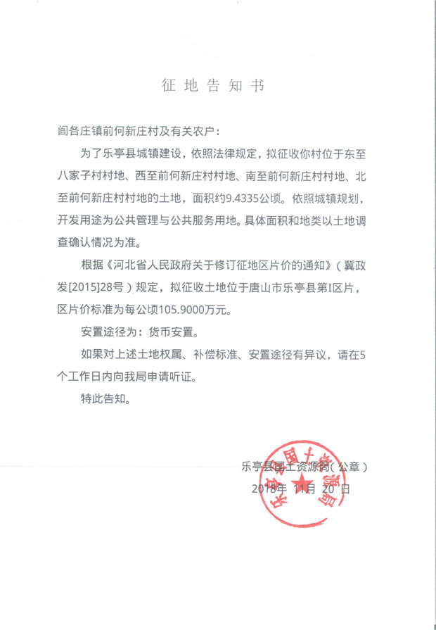 日前唐山樂亭縣政府發(fā)布了《樂亭縣固廢綜合處理廠生活垃圾焚燒發(fā)電項目建設(shè)用地征地告知書》,該告知書顯示擬征收樂亭縣閻各莊鎮(zhèn)前何新莊村位于東至八家子村村地、西至前何新莊村村地、南至前何新莊村村地、北至前何新莊村村地的土地,面積約9.4335公頃。具體內(nèi)容如下: