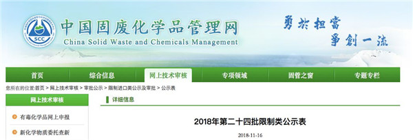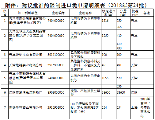 日前中國固廢化學品管理網(wǎng)發(fā)布了《建議批準的限制進口類申請明細表(2018年第24批)》,其中涉及30家企業(yè)具體內(nèi)容如下: