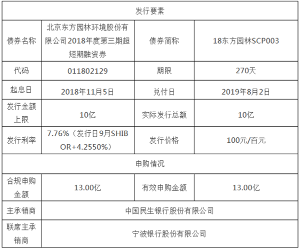 11月5日東方園林發(fā)布了《東方園林超短期融資券發(fā)行情況公告》,具體內(nèi)容如下:北京東方園林環(huán)境股份有限公司超短期融資券發(fā)行情況公告證券代碼:002310股票簡(jiǎn)稱:東方園林公告編號(hào):2018-163本公司及董事會(huì)全體成員保證信息披露的內(nèi)容真實(shí)、準(zhǔn)確、完整,沒(méi)有虛假記載、誤導(dǎo)性陳述或重大遺漏。北京東方園林...