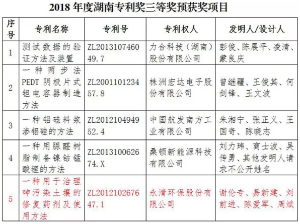 近日,湖南省專利局公示2018年度湖南專利獎評審結果,永清環(huán)保發(fā)明專利《一種用于治理砷污染土壤的修復藥劑及使用方法》(專利號:ZL201210267647.1)獲湖南省專利獎三等獎。 本發(fā)明的目的在于克服現(xiàn)有技術的不足,創(chuàng)新提供一種原料來源廣泛、制備簡單、操作使用方便、效率高、治理效果好的,用于治理...