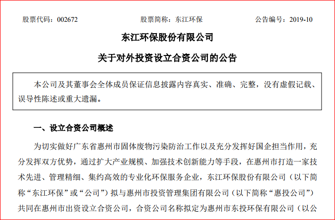 2019年1月24日,東江環(huán)保股份有限公司董事會發(fā)布公告稱,擬出資成立合資公司,打造一家專業(yè)化的環(huán)保服務企業(yè)。 公告顯示,東江環(huán)保擬與與惠州市投資管理集團有限公司(簡稱“慧投公司”)共同出資在惠州市成立合資公司,公司名擬定為“惠州市東投環(huán)保有限公司”,...